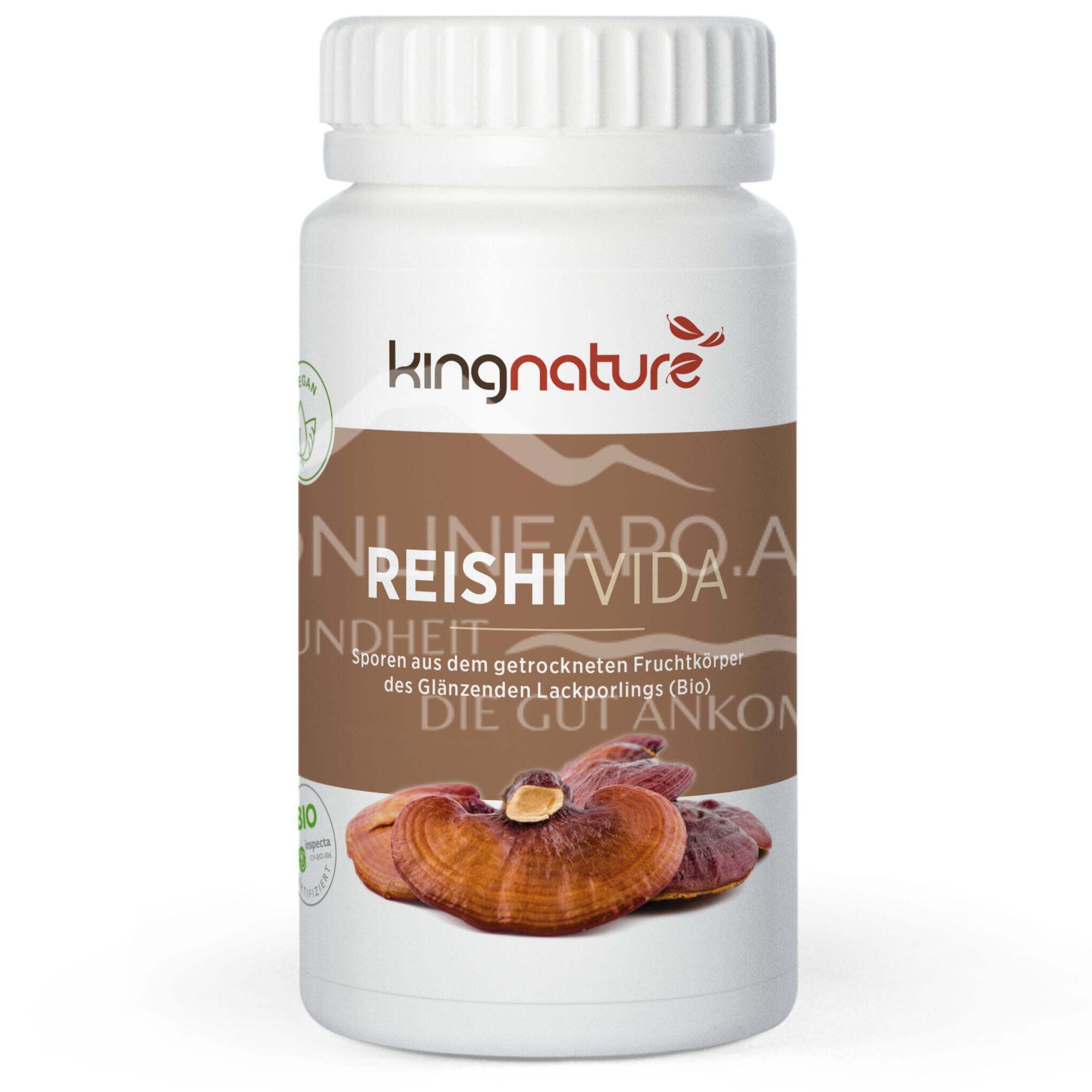 Kingnature Reishi Vida Kapseln sind ein Nahrungsergänzungsmittel mit 76% Bio-Sporen von Bio-Reishi-Pilzen (auch Glänzender Lackporling, Ganoderma lucidum oder Ling Zhi). Pulver aus den Sporen des Fruchtkörpers des Reishi Vitalpilzes.