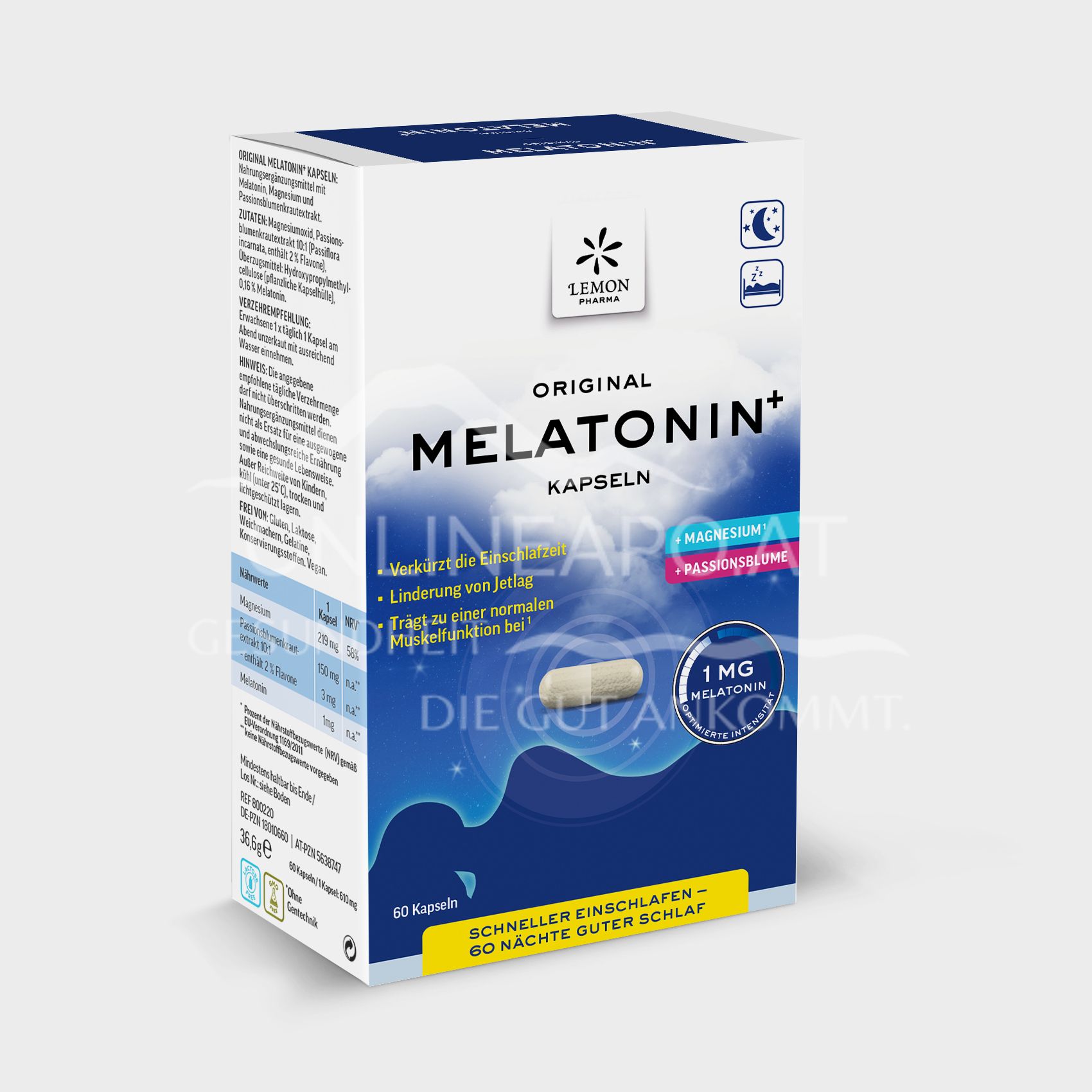 Lemon Pharma Original Melatonin+ Kapseln sind ein Nahrungsergänzungsmittel mit Melatonin, Magnesium und Passionsblumenkrautextrakt.