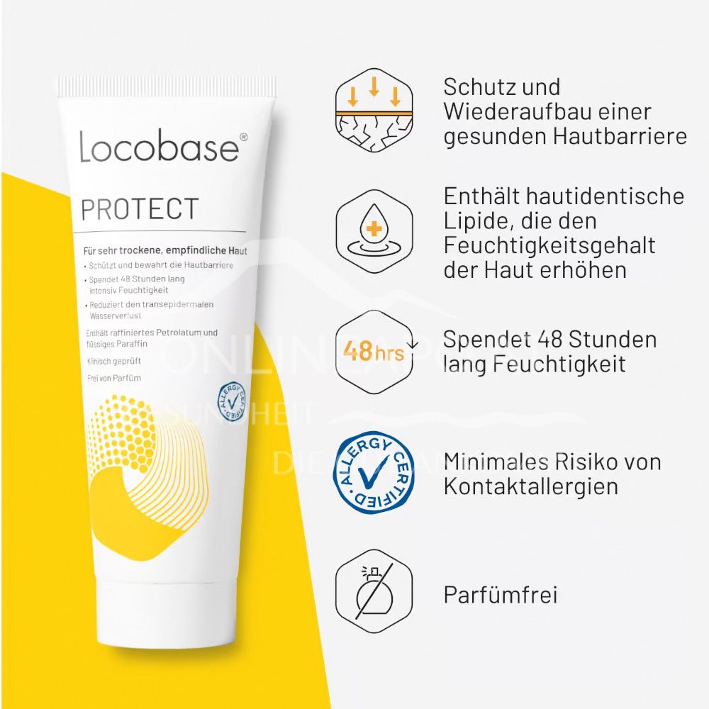 Die Formulierung der Locobase Protect kombiniert die Eigenschaften von Creme und Salbe: Sie hat zugleich einen hohen Wasser- und einen besonders hohen Lipidanteil. So bildet sie eine schützende Lipidbarriere, während sie gleichzeitig die Haut atmen lässt und verhindert, dass die natürliche Feuchtigkeit der Haut verloren geht. Locobase Protect wird für sehr empfindliche sowie trockene Haut und als ergänzende Pflege für atopische Haut empfohlen.