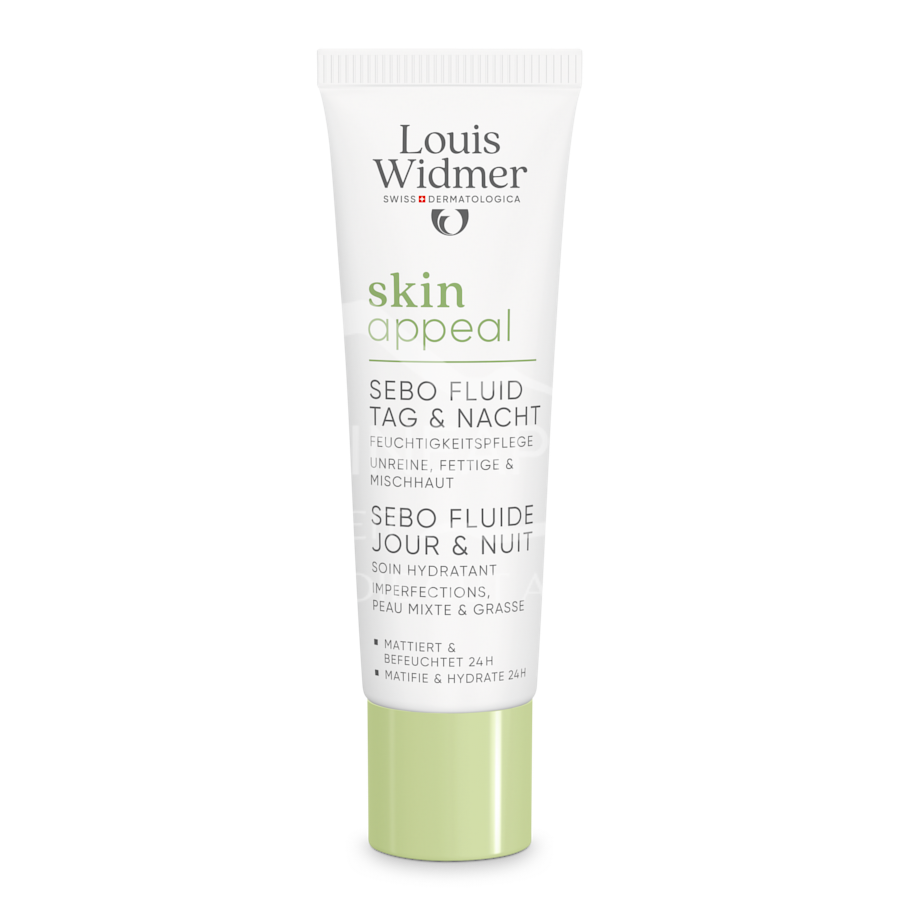 Louis Widmer Skinappeal Sebo Fluid Tag & Nacht bekämpft Unreinheiten, reduziert Talgproduktion & mattiert fettige Haut. Für ein klares, verfeinertes Hautbild, Tag und Nacht.