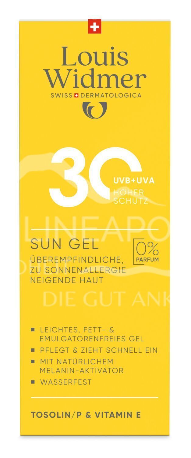 Das Louis Widmer Sun Gel 30 bietet hohen, wasserfesten Schutz für sensible Haut. Es ist ideal bei Neigung zu Sonnenallergie (Mallorca-Akne). Die pflegende Formel mit Vitamin E schützt die Zellen vor freien Radikalen und vorzeitiger Hautalterung.