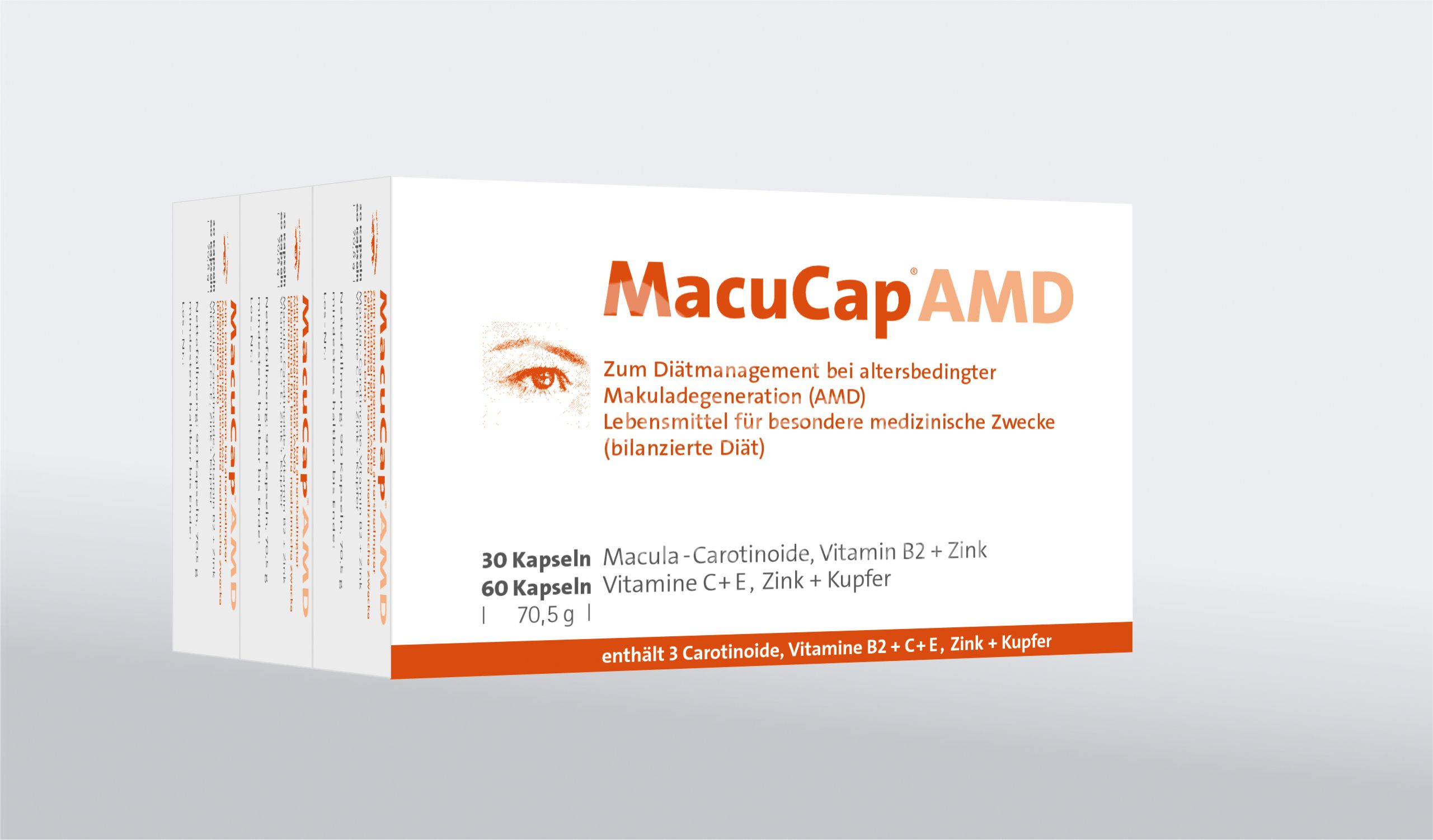 Die MacuCap® AMD Kapseln sind ein Lebensmittel für besondere medizinische Zwecke (bilanzierte Diät). Zum Diätmanagement bei altersbedingter Makuladegeneration (AMD).