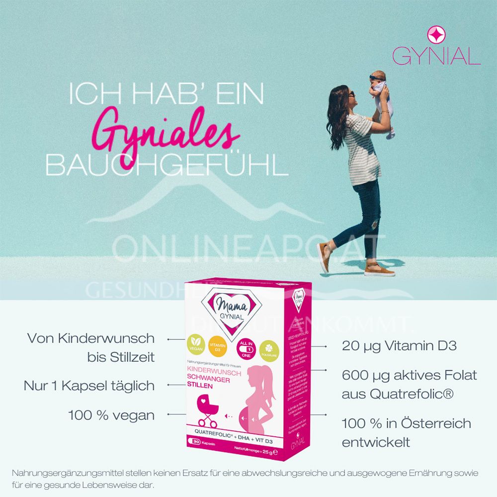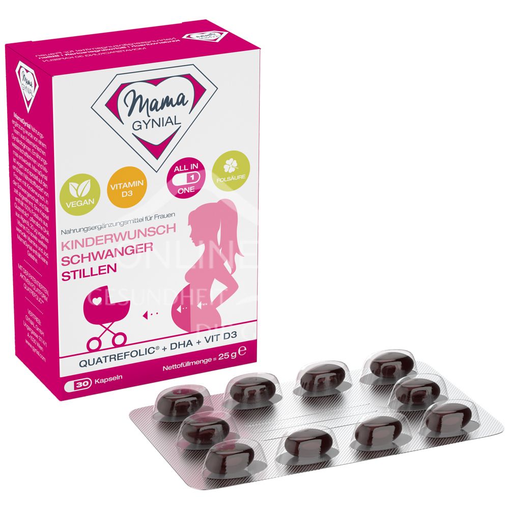 MamaGynial Kapseln: Die optimale Versorgung bei Kinderwunsch, in der Schwangerschaft & Stillzeit. Mit Folsäure, DHA & wichtigen Vitaminen für die gesunde Entwicklung Ihres Babys. Decken Sie jetzt Ihren Nährstoffbedarf.
