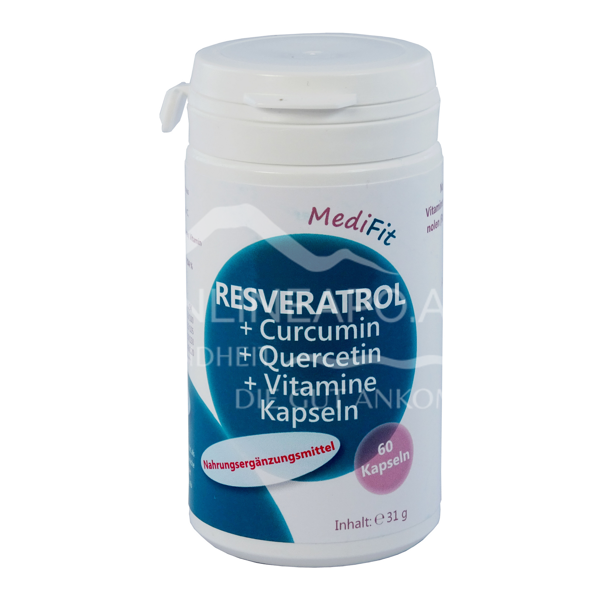 MediFit Resveratrol + Curcumin + Quercetin + Vitamine Kapseln sind ein Nahrungsergänzungsmittel, das die Gesundheit und das Wohlbefinden unterstützen kann. Enthalten eine Kombination aus Resveratrol, Curcumin, Quercetin und Vitaminen.