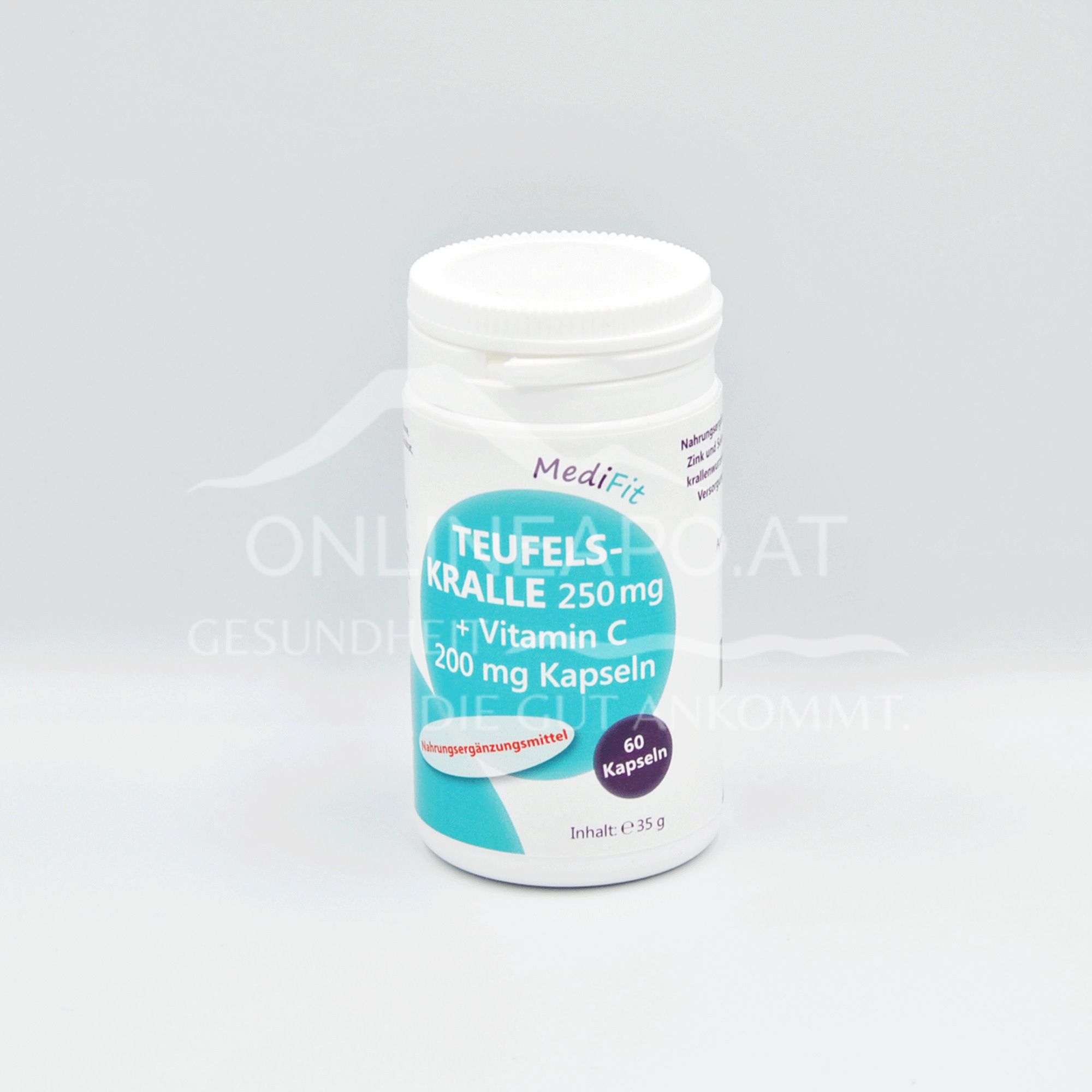 Die MediFit Teufelskralle 250 mg + Vitamin C 200 mg Kapseln sind ein Nahrungsergänzungsmittel mit Teufelskralle 250 mg und Vitamin C 200 mg pro Kapsel.