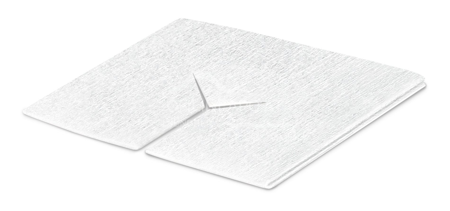 Sterile Schlitzkompresse aus Vliesstoff, bestehend aus Viskose- und Polyesterfasern, erhältlich in verschiedenen Größen, mit einem Y-Schnitt. Die sterilen Kompressen sind in Papierfolienbeutel verpackt.