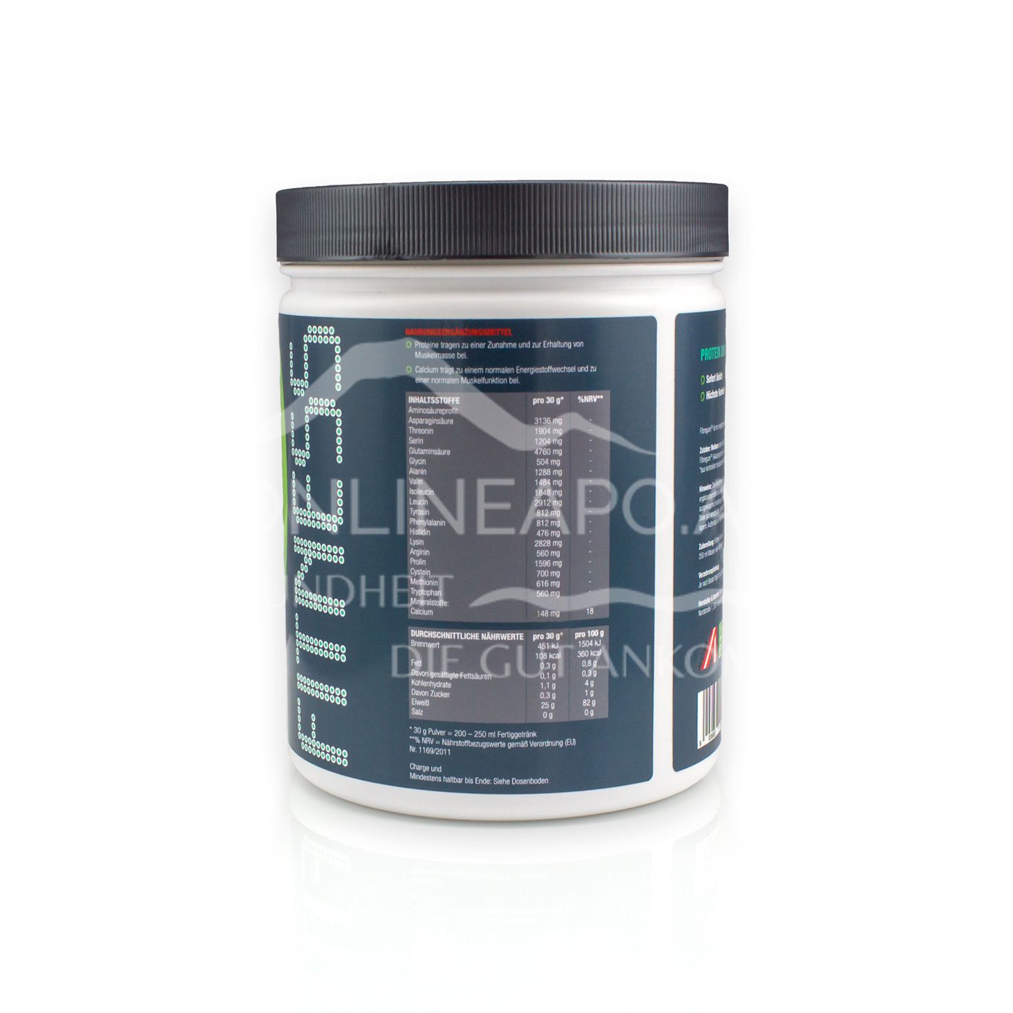 - Zusammensetzung pro Tagesdosis (30 g) %NRV*: Asparaginsäure 2759 mg, Threonin 1675 mg,g Serin 1059 mg, Glutaminsäure 4188 mg, Glycin 443 mg, Alanin 1133 mg, Valin 1305 mg, Isoleucin 1626 mg, Leucin 2562 mg, Tyrosin 714 mg, Phenylalanin 714 mg, Histidin 418 mg, Lysin 2488 mg, Arginin 492 mg, Prolin 1404 mg, Cystein 616 mg, Methionin 542 mg, Tryptophan 492 mg, Calcium 148 mg 18. *%NRV – Referenzmenge laut EU-Verordnung Nr. 1169/2011.