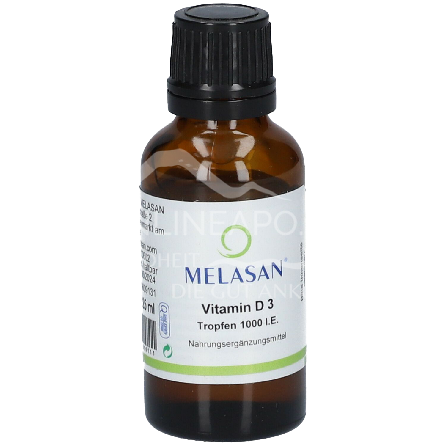 Die Melasan Vitamin D3 Tropfen sind ein Nahrungsergänzungsmittel mit 25 µg entspricht 1000 I.E. Vitamin D3 pro Tagesdosis.