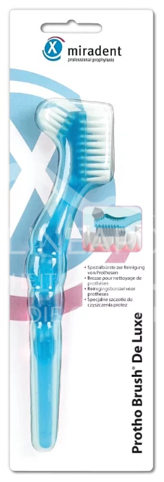 Die miradent-Prothesenbürste ist bis ins Detail durchdacht: Der große, ergonomisch geformte Fingerform- Griff erleichtert besonders älteren Menschen die Prothesenreinigung. Das große Borstenfeld ist für die Oberflächen der Prothesen geeignet. Mit dem V-förmigen kleinen Borstenfeld lassen sich die schwer zu erreichenden Innenseiten perfekt säubern.