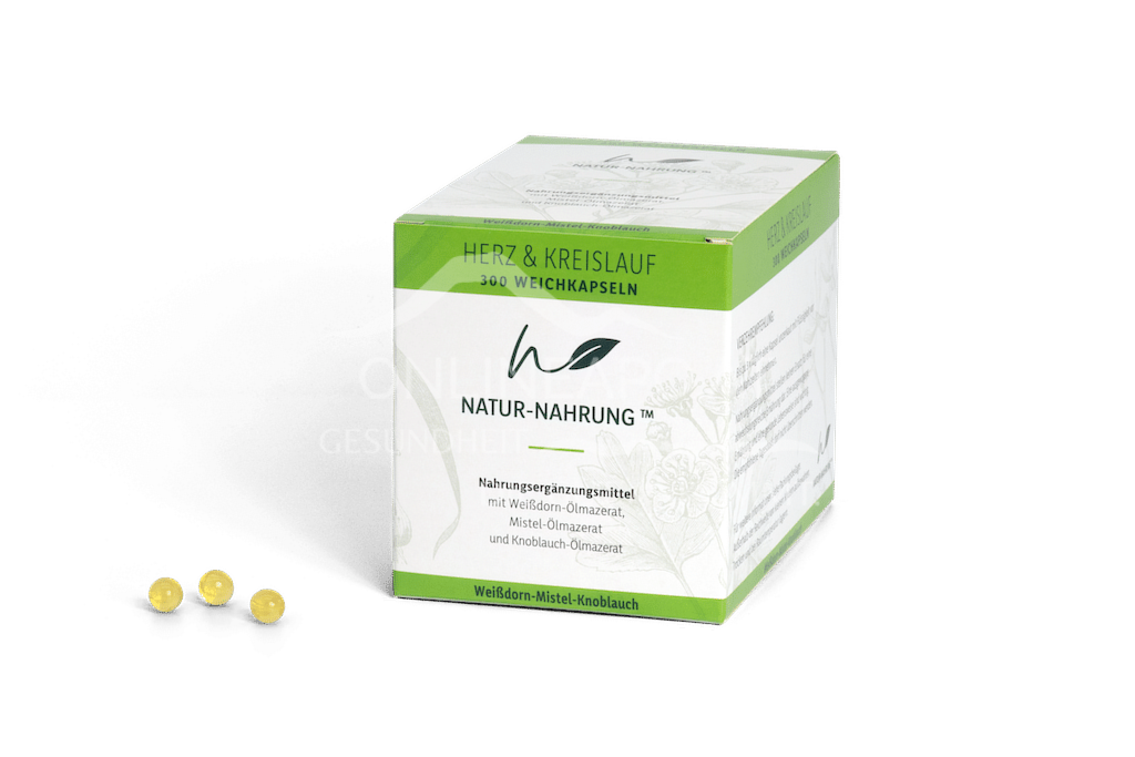 Die Natur-Nahrung Herz & Kreislauf Weichkapseln sind ein Nahrungsergänzungsmittel mit einer natürlichen, pflanzlichen Kombination aus folgenden Inhaltsstoffen: Weißdorn, Mistel und Knoblauch.