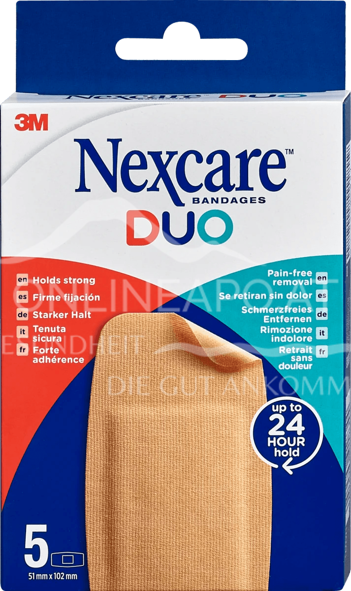 Nexcare™ DUO Pflaster sind die richtige Wahl, wenn Sie ein Pflaster möchten, das fest haftet, aber auch sanft ablösbar ist. Diese Pflaster sind äußerst haltbar und zugleich erstaunlich sanft. Sie haften ultrastark bis zu 24 Stunden und lassen sich durch unseren speziellen Silikonklebstoff schmerzfrei entfernen. Die 360°-Abdichtung um die Wundauflage bietet Schutz rund um die Wunde. Ein Muss für jeden Verbandkasten.