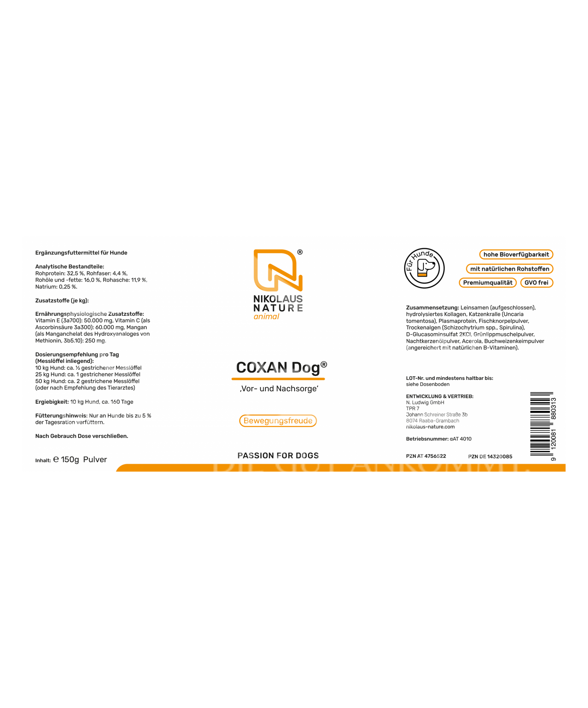 Das Nikolaus Nature animal COXAN Dog® "Vor- & Nachsorge" Pulver ist ein Ergänzungsfuttermittel für Hunde. Formuliert mit hochwertigen Inhaltsstoffen zur Unterstützung der allgemeinen Gesundheit und Wohlbefindens Ihres Vierbeiners.