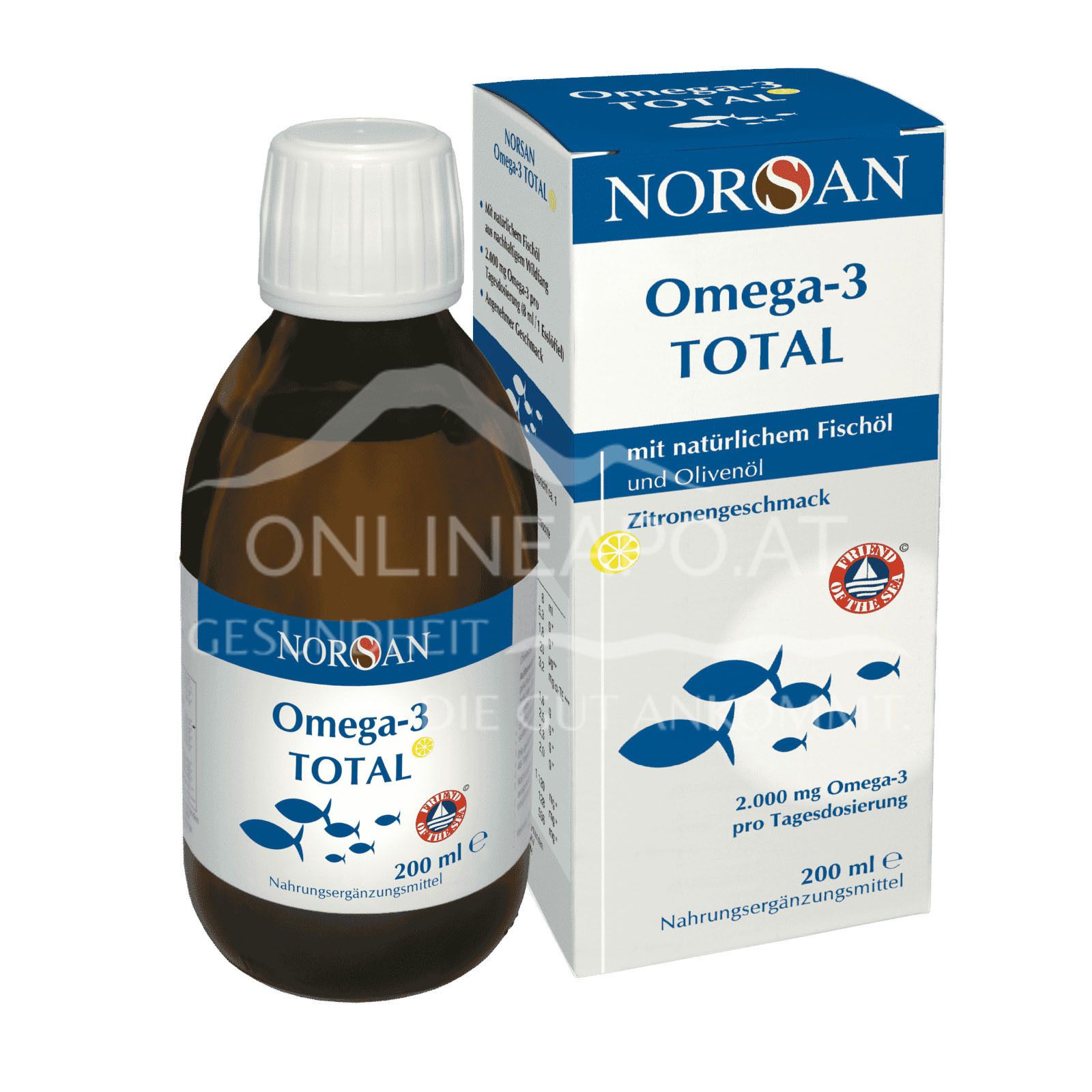 NORSAN Omega-3 Total enthält eine einzigartige Kombination von einem natürlichen, nicht-konzentrierten Fischöl aus Wildfang sowie einemkaltgepressten Olivenöl. NORSAN Fischöl wird in Norwegen produziert. Die empfohlene Tagesdosis von 8 ml (1 Esslöffel) beinhaltet 5,3 Gramm Fischöl und1,8 Gramm Olivenöl.