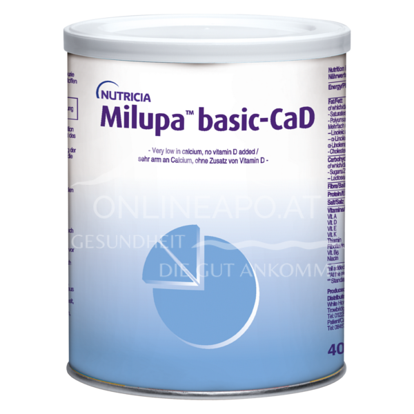 - Nährwertzusammensetzung pro Portion (12,9 g Milupa basic-CaD (= 3 Messlöffel) + 90 ml Trinkwasser (Calciumgehalt beachten) = 100 ml trinkfertige Nahrung): Energie kJ 277, Energie kcal 66, Fett g 3,3 davon gesättigte Fettsäuren g 1,3 davon mehrfach ungesättigte Fettsäuren g 0,41, Linolsäure g 0,331, a-Linolensäure g 0,0574, Kohlenhydrate g 7,1 davon Zucker g 7,1, Lactose g 7,06, Eiweiß g 1,9, Salz g 0,07, Vitamin A µg 75,3, Vitamin D µg -, Vitamin E mg (α-TE) 1,17, Vitamin C mg 8,98, Vitamin K µg 3,26, Thiamin (Vitamin B₁) mg 0,06, Riboflavin (Vitamin B₂) mg 0,10, Niacin mg 0,60, Niacin mg NE 1,05, Vitamin B₆ mg 0,04, Folsäure µg 7,00, Folat µg 11,7, Vitamin B₁₂ µg 0,13, Biotin µg 1,80, Pantothensäure mg 0,35, Natrium mg 29,3, Kalium mg 60,1, Chlorid mg 40,0, Calcium mg < 3,75, Phosphor mg 22,1, Magnesium mg 5,50, Eisen mg 1,00, Kupfer mg 0,050, Zink mg 0,50, Mangan mg 0,007, Jod µg 8,98, Molybdän µg 2,51, Selen µg 1,60, Chrom µg 1,98, L-Carnitin mg 3,90, Taurin mg 0,90, Cholin mg 11,7, Inositol mg 3,3, Osmolarität mOsmol/l 270.