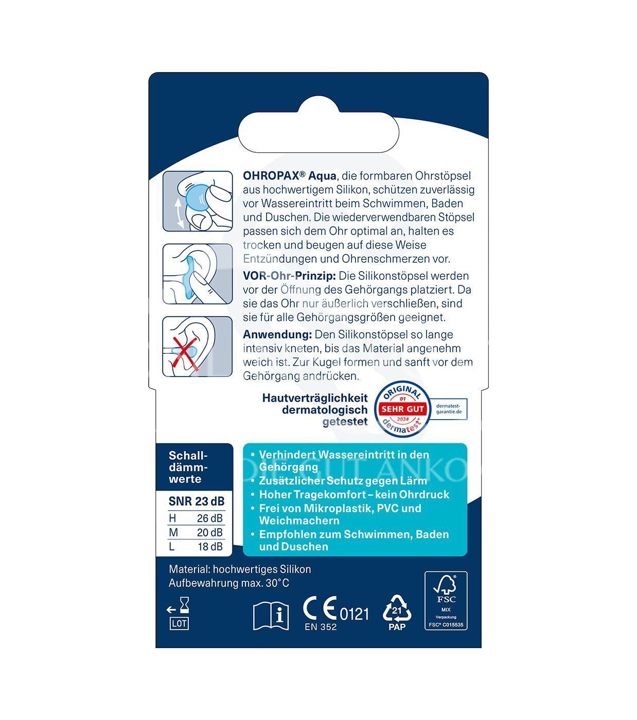 - OHROPAX® Silicon AQUA ist besonders zum Schutz vor Eindringen von Wasser beim Schwimmen und Baden geeignet. Aufgrund seines dichten Abschlusses und des hohen Tragekomforts ist OHROPAX® Silicon AQUA aber auch bestens zum Schutz vor Lärm und Geräuschen geeignet wie z.B. beim Schlafen und Entspannen.