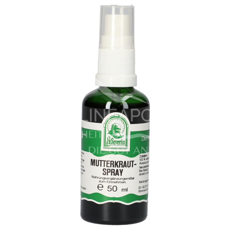 Der Pater Severin Mutterkraut Spray ist ein Nahrungsergänzungsmittel nach alter Klosterrezeptur zum Einnehmen. Hergestellt aus einem hochwertigen wässrig/alkoholischen Auszug aus Mutterkraut.