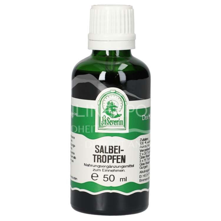 Die Pater Severin Salbei Tropfen sind ein Nahrungsergänzungsmittel zum Einnehmen. Die Salbeitropfen enthalten einen hochwertigen wässrig/alkoholischen Auszug aus Salbeiblättern.