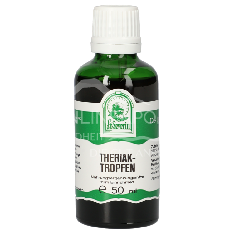 Die Pater Severin Theriak Tropfen sind ein Nahrungsergänzungsmittel zum Einnehmen. Die Theriaktropfen enthalten einen hochwertigen wässrig/alkoholischen Auszug aus Theriak im Verhältnis 1:5.