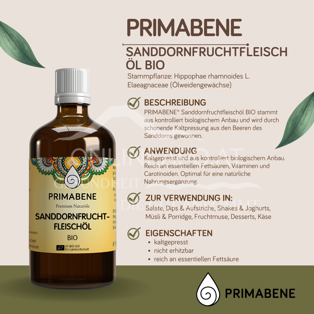 Entdecken Sie das Primabene® Sanddornfruchtfleischöl Bio als hochwertige Ergänzung. Das reine Öl aus kontrolliert biologischem Anbau ist reich an ungesättigten Fettsäuren und unterstützt Ihr allgemeines Wohlbefinden.