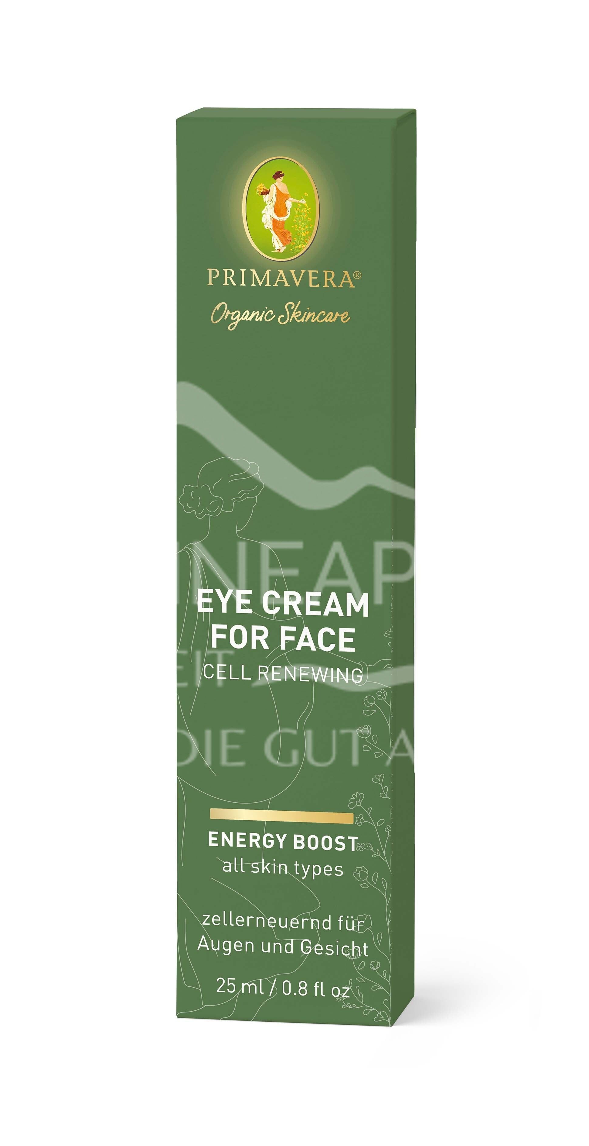 Die hochwirksame Eye Cream ist ein duftendes Geschenk an die Haut. Hochwertige Öle und naturreine Pflanzenwirkstoffe in sinnlicher Komposition, sind ihr Geheimnis. Als Kombination aus Augen- und Gesichtscreme, für alle Hauttypen, sorgt sie für einen ultimativen Feuchtigkeits-Flash mit Sofortwirkung. Ideal für alle Gesichtszonen, welche mit einem sofort Glättenden und Straffenden Effekt versorgt werden sollen. Mit den wirkstarken Pflanzenkräften von Arjuna Rinde und dem energetisierenden Taurin der Jania Rubens Alge mindert sie Falten, Augenringe und Schwellungen, und stärkt sanft die Augen- und Mundpartie. Die revitalisierende und straffende PRIMAVERA Eye Cream for Face - Cell Renewing erfrischt, sorgt für Glow und neue Energie und lässt uns in unserer ganz eigenen Schönheit erstrahlen.
