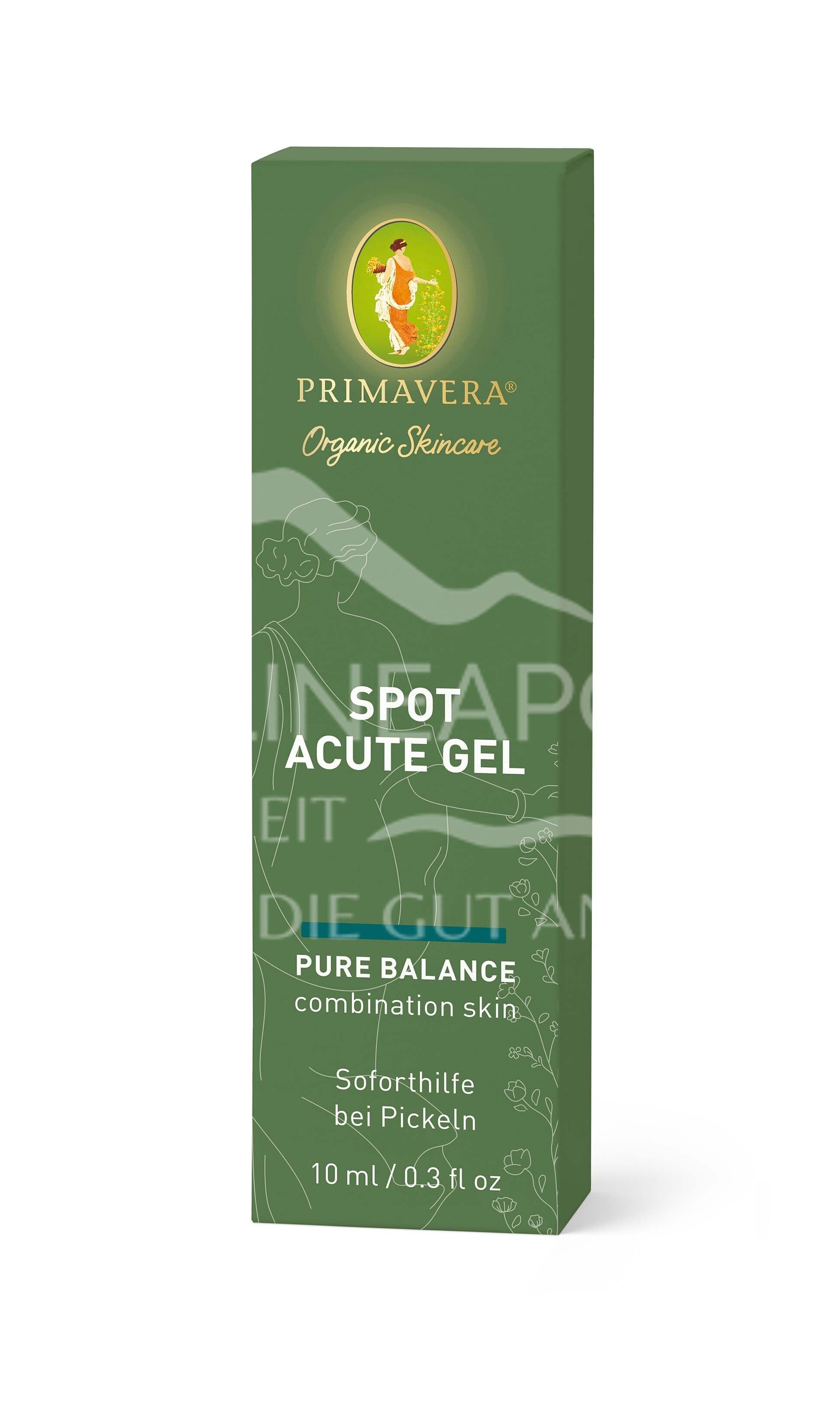 Das Primavera Spot Acut Gel ist die natürliche Soforthilfe bei Hautunreinheiten, Mitesser und verstopften Poren. Durch die wirkstarke Komposition naturreiner Kräuterkomplexe aus Bio Salbei, Bio Süßholz, Bio Kamille und Weidenrindenextrakt harmonisiert und beruhigt es unsere Haut nachhaltig. Zart duftend reguliert und minimiert das leichte, nicht fettende Gel überschüssigen Talg und sorgt auf diese Weise ganz natürlich für ein klares und ebenmäßig schönes Hautbild. Im Gel verwirklicht sich das einzigartige Zusammenspiel von reiner Naturkraft und innovativen Leitpflanzenkompositionen mit höchster Wirksamkeit. Das Ergebnis: strahlend schöne Haut in ihrer natürlichen Balance.