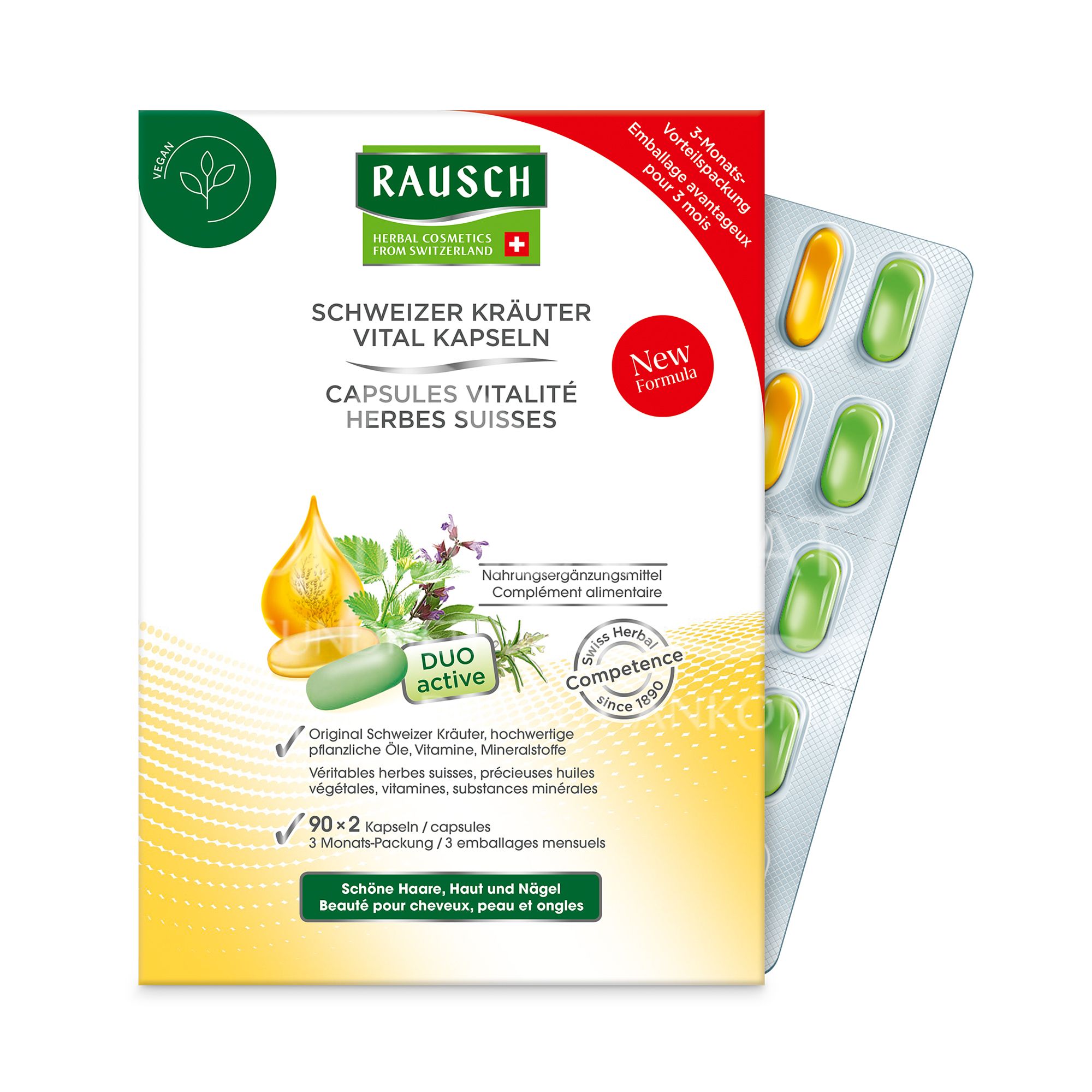 Die RAUSCH Schweizer Kräuter Vital Kapseln sind ein Nahrungsergänzungsmittel mit einer einzigartigen Wirkstoffkombination aus 3 hochwertigen Pflanzenölen, 8 vitalisierenden Kräuter-Extrakten und 12 Vitaminen und Mineralstoffen.
