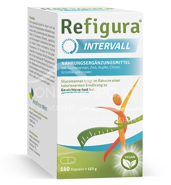 - Hinweise: Nicht für Schwangere, Stillende, Jugendliche und Kinder geeignet. Enthält Glucomannan: Für Personen mit Schluckbeschwerden nicht geeignet. Bei Schluckbeschwerden und bei ungenügender Flüssigkeitszufuhr während der Einnahme besteht Erstickungsgefahr. Medikamente und Vitamine sollten in einem zeitlichen Abstand von einer Stunde vor bzw. vier Stunden nach Refigura Intervall eingenommen werden. Kühl, trocken und lichtgeschützt lagern.