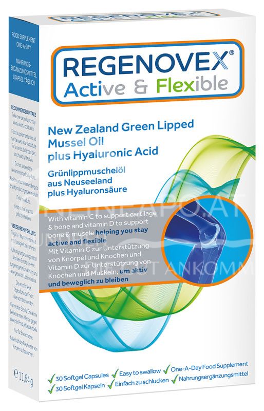 Die Regenovex® Active & Flexible Weichkapseln sind ein Nahrungsergänzungsmittel mit Grünlippmuschelöl aus Neuseeland plus Hyaluronsäure, Vitamin C und Vitamin D.