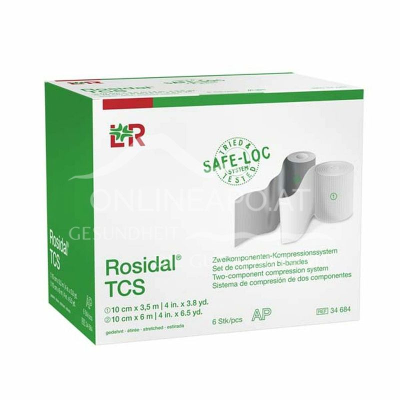 Das Rosidal® TCS Zweikomponenten-Kompressionssystem bestehend aus einer polsternden und einer Kurzzug-Kompressionsbinde dient zur Kompression, zur Fixierung von Verbänden, zum Stützen und Entlasten und zur Ruhigstellung von Körperteilen.