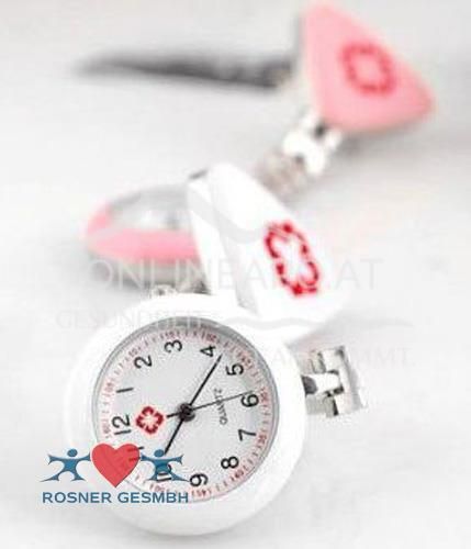 Für Pflegepersonal in Kliniken und Arztpraxen, mit stabilem Clip und Sekundenzeiger, Ziffernblatt-Durchmesser ca. 2,3 cm, wird aus Hygienegründen nicht auf der Hand sondern auf einer kurzen Kette befestigt mit einem Clip oft freihängend an der Kleidung getragen. Das Ziffernblatt ist um 180° verdreht und zeigt noch Skalen an, die z.B. das Messen des Pulses beim Patienten erleichtern.