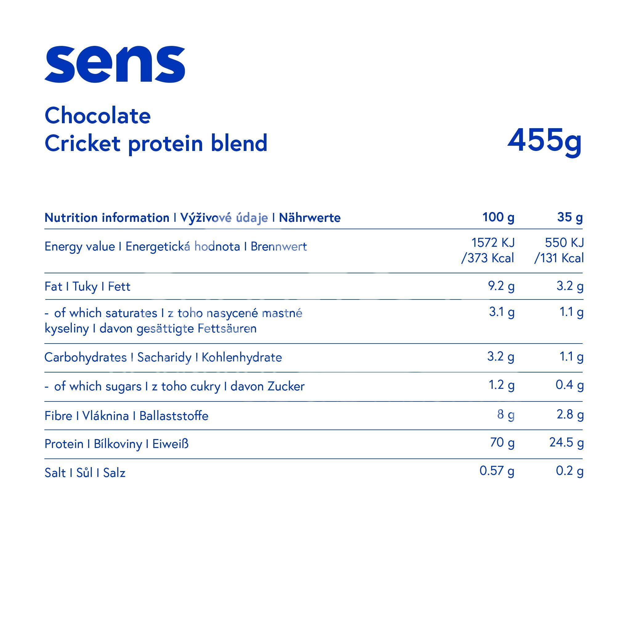 - Zutaten: Erbsenprotein, entfettetes Kakaopulver (15%), Grillenmehl (Acheta domesticus) (10%), Sonnenblumenprotein, Verdickungsmittel Guarkernmehl, Sonnenblumenlecithin, natürliches Schokoladenaroma (0,5%), Salz, Sucralose.