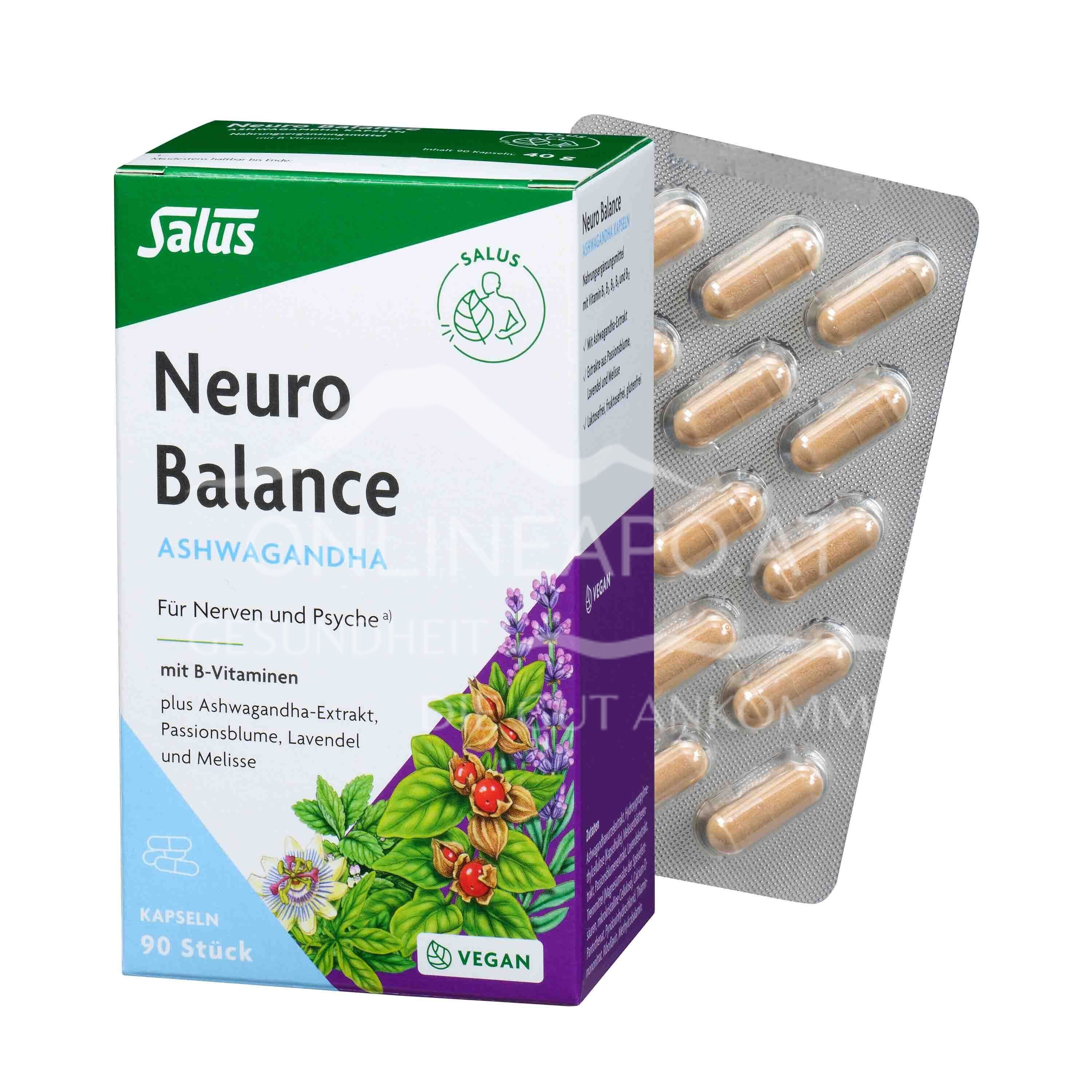 Salus Neuro Balance Ashwagandha Kapseln sind ein Nahrungsergänzungsmittel mit den Vitaminen B1, B2, B5, B6 und B12, Ashwagandha, Passionsblume, Lavendel und Melisse zur Unterstützung der Nerven und Psyche*.