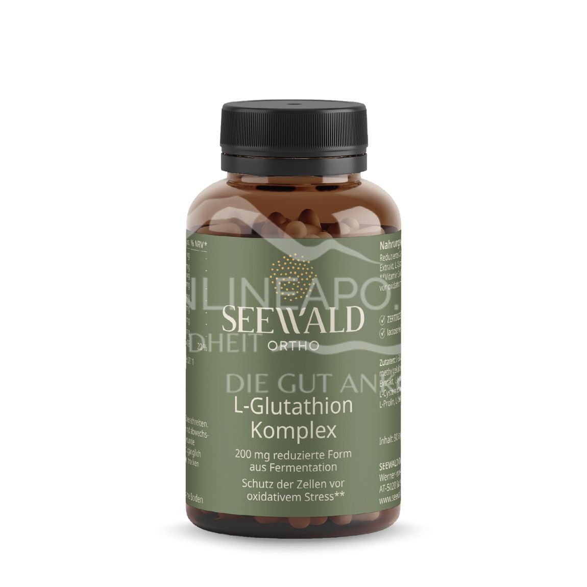 Die Seewald Ortho L-Glutathion Komplex Kapseln sind ein Nahrungsergänzungsmittel– Reduziertes Glutathion, OPC Traubenkern-Extrakt, L-Cystein und weitere Aminosäuren. Vitamin E als Beitrag zum Schutz der Zellen vor oxidativem Stress.