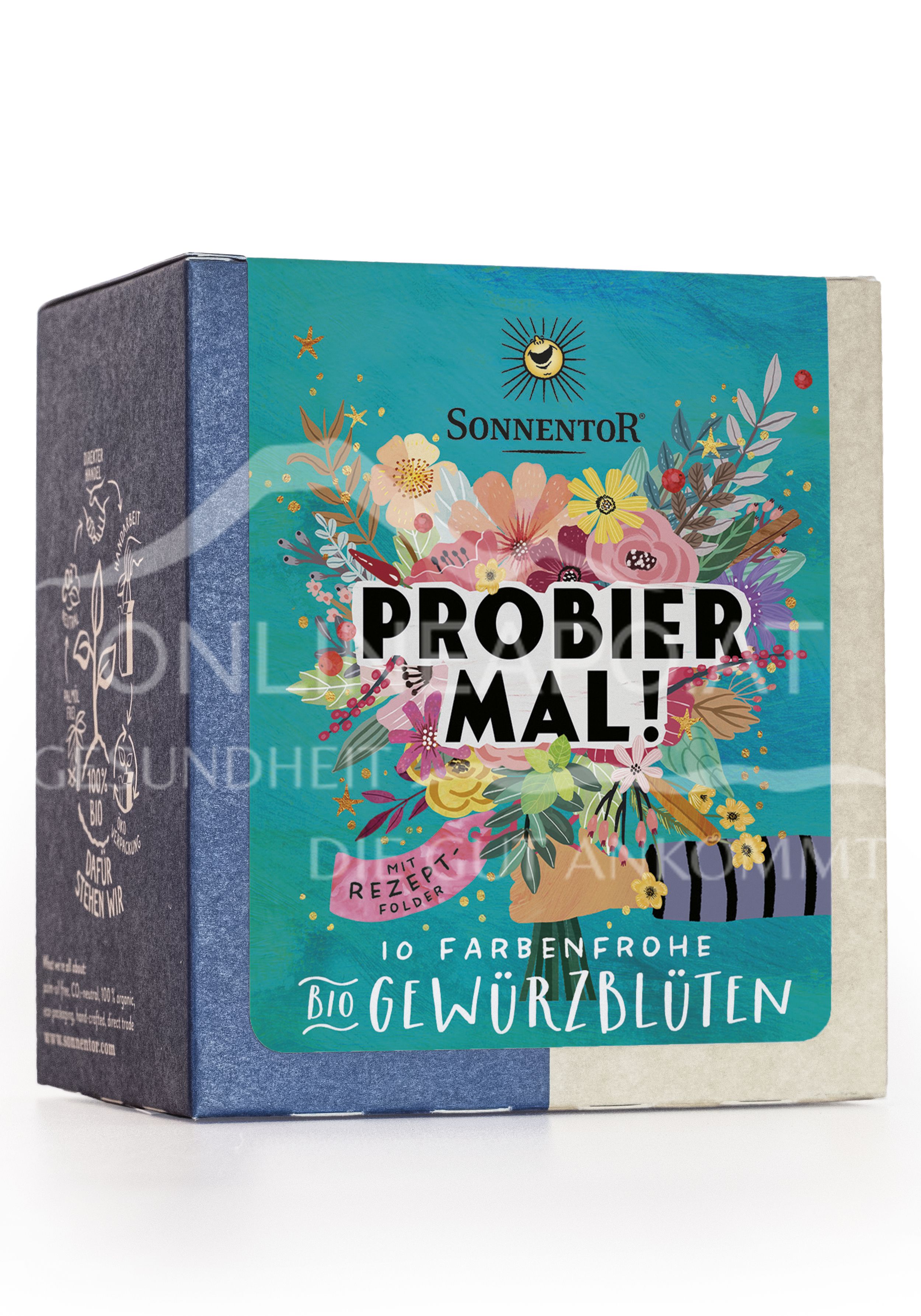 Wenn farbenfrohe Blüten auf feine Gewürze treffen, ist Abwechslung auf dem Teller garantiert. Von Flower Power über Sonnenkuss bis zum Scharfmacher: Dieses Probier mal! ist ein bunter Strauß voll süßer und pikanter Gewürzblüten. Sieben verschiedene Mischungen und ein Rezeptheftchen lassen die Ideen sprießen. Gewürzbeutel aufreißen, aufkochen und aufblühen!