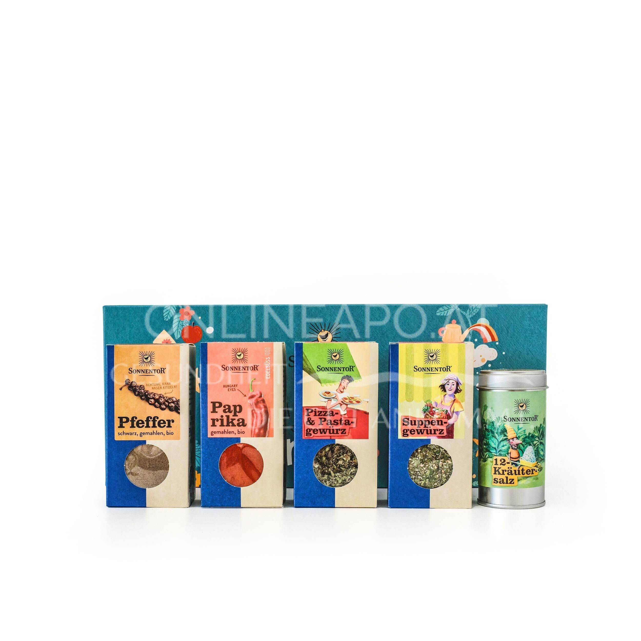 Je 1 Stk. 12 Kräutersalz bio Streudose, Pfeffer schwarz gemahlen bio Packung, Paprika edelsüß gemahlen bio Packung, Suppengewürz bio Packung, Pizza- und Pastagewürz bio Packung. Zutaten, Allergene und Nährwerte der einzelnen Sorten findest du bei den einzelnen Produkten.