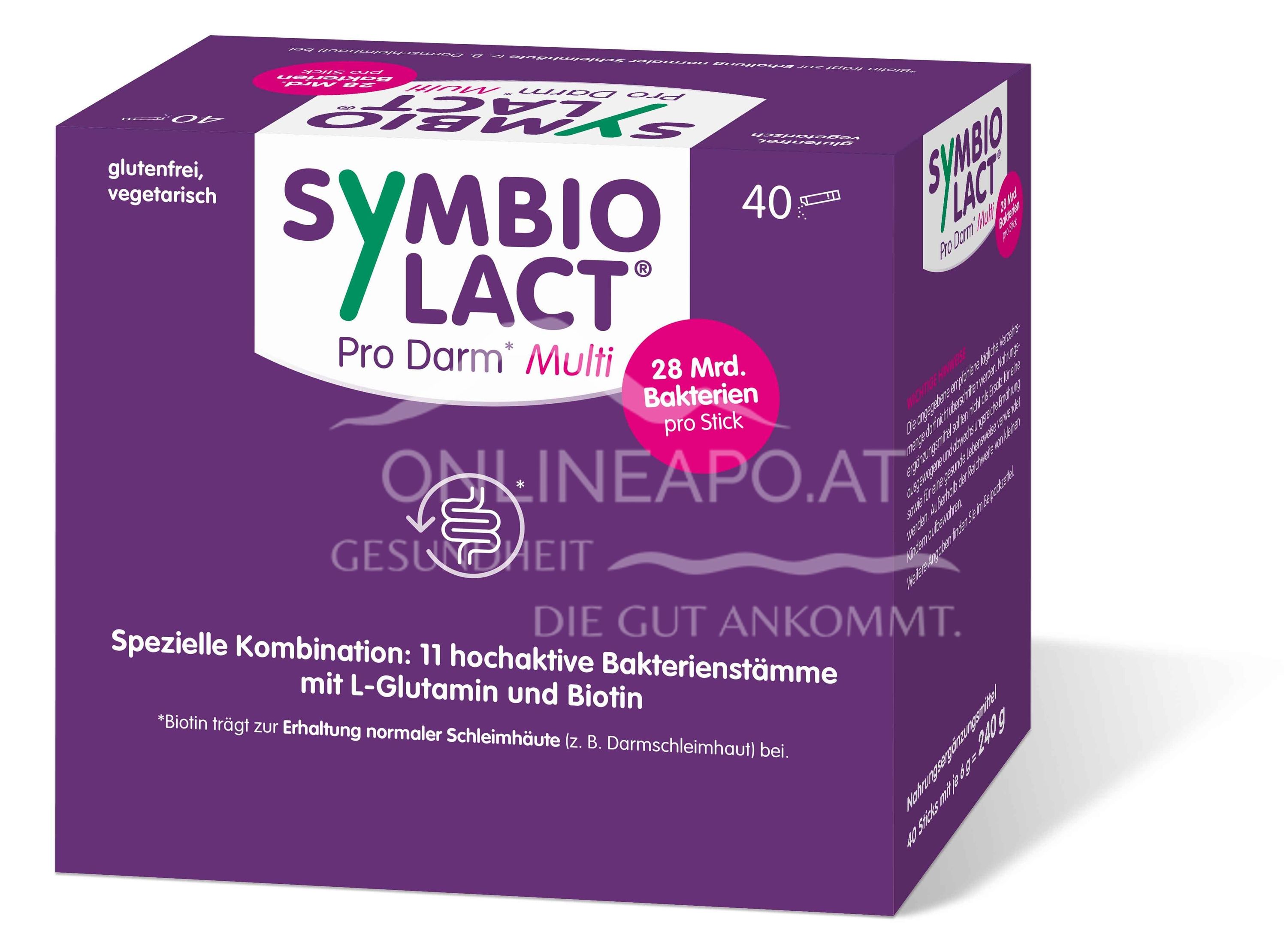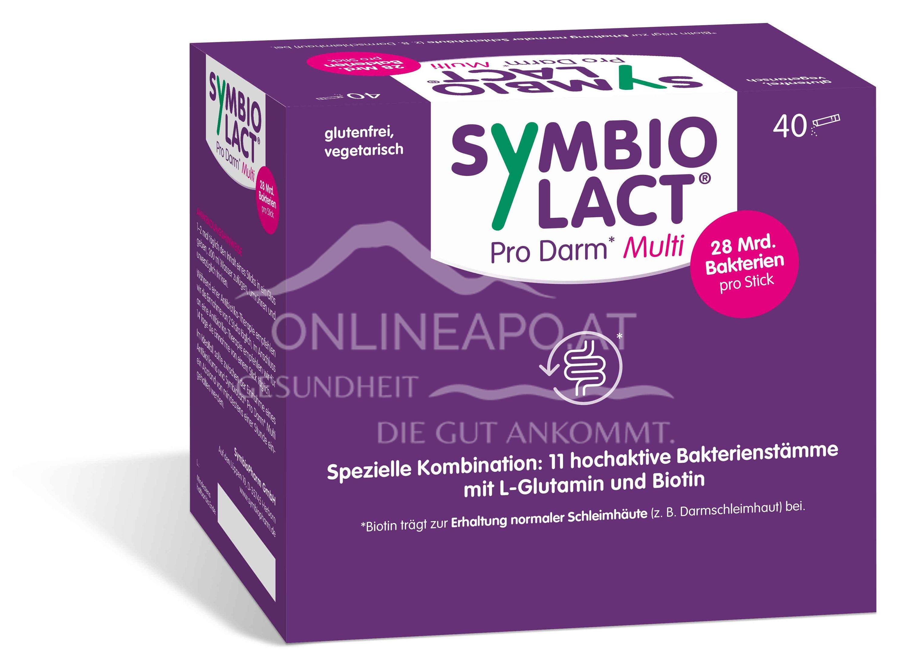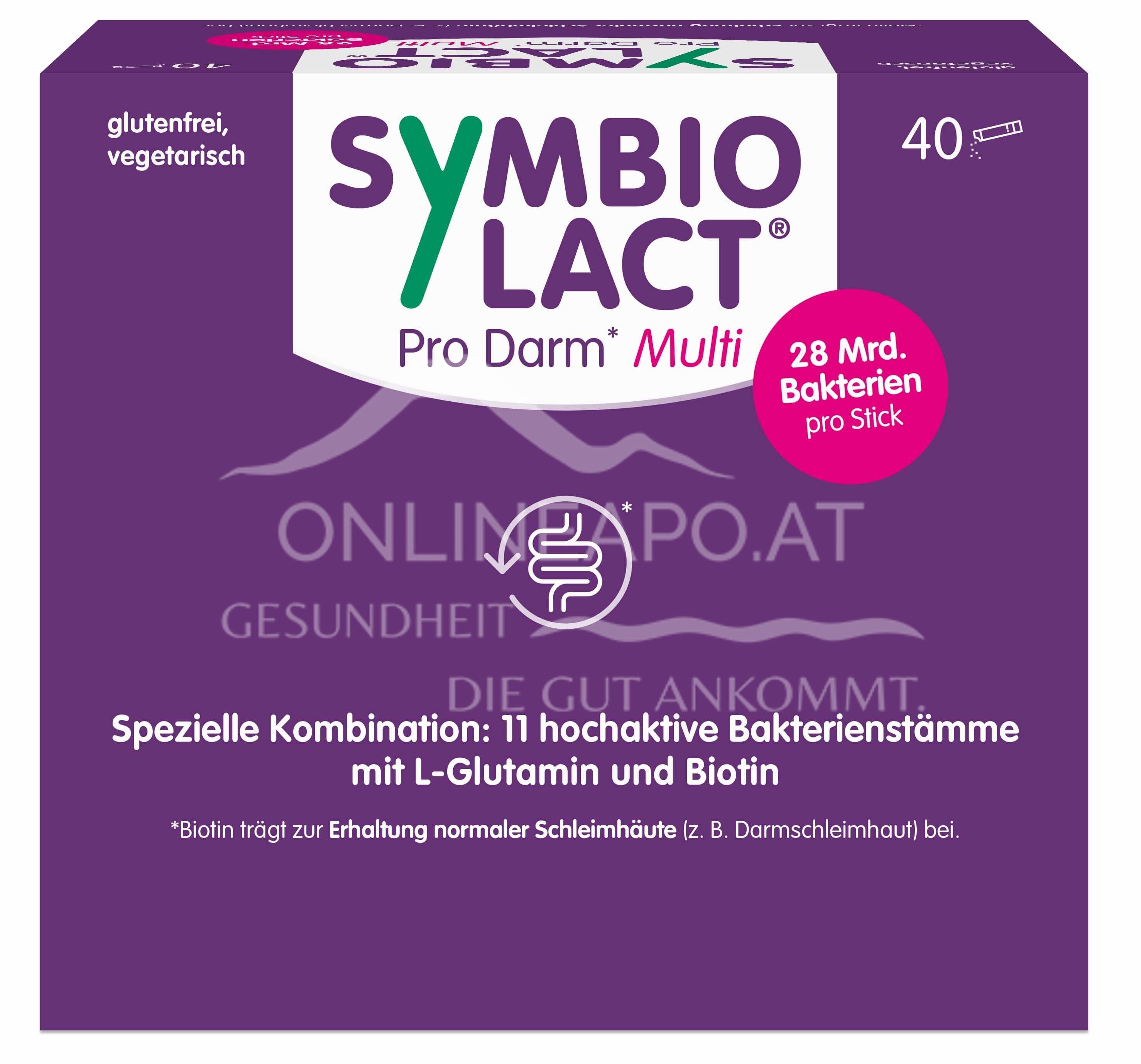 - 1 Portion SymbioLact® Pro Darm* Multi (1 Stick) enthält eine Mischung gefriergetrockneter Milchsäurebakterien aus Lactobacillus delbrueckii (LBY-27™), Lactobacillus acidophilus (DDS-1®), Streptococcus thermophilus (STY-31™), Lactobacillus acidophilus (LA-5®), Bifidobacterium animalis subsp. lactis (UABla-12™), Bacillus coagulans (SC208™), Bacillus subtilis (HU58™), Bifidobacterium animalis subsp. lactis (BB-12®), Lactobacillus rhamnosus (LGG®), Bifidobacterium bifidum (UABb-10™), Bifidobacterium longum (UABl-14™) mit einer Gesamtkeimzahl von ≥ 2,8 × 1010 KBE (koloniebildende Einheiten). Die genannten Bakterienstämme sind (registrierte) Trademarks von Chr. Hansen A/S oder Novonesis Group.