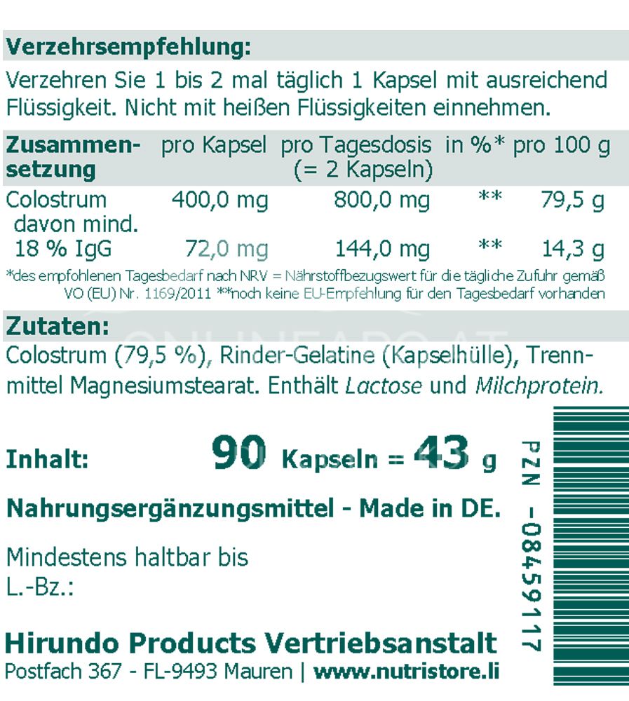 - Zutaten: Colostrum (79,5 %), Rinder-Gelatine (Kapselhülle), Trennmittel Magnesiumstearat. Enthält Lactose und Milchprotein.