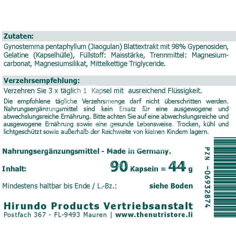 - Zutaten: Gynostemma pentaphyllum (Jiaogulan) Blattextrakt mit 98% Gypenosiden, Gelatine (Kapselhülle), Füllstoff: Maisstärke, Trennmittel: Magnesiumcarbonat, Magnesiumsilikat, Mittelkettige Triglyceride.
