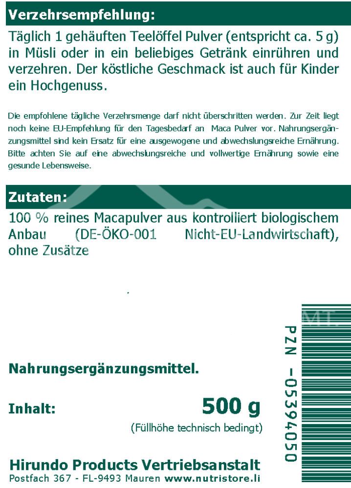 Zutaten: 100 % reines Macapulver aus kontrolliert biologischem Anbau (DE-ÖKO-001 Nicht-EU-Landwirtschaft), ohne Zusätze. Zur Zeit liegt noch keine EU-Empfehlung für den Tagesbedarf an Maca Pulver vor.