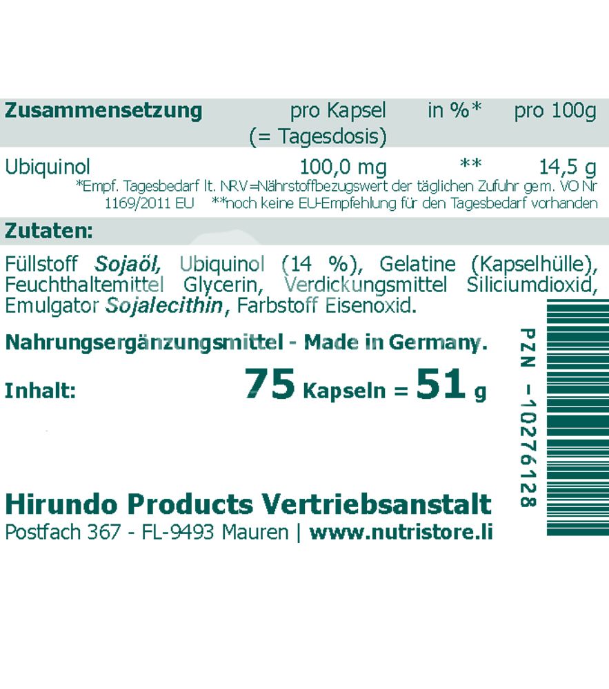 - Zutaten: Füllstoff Sojaöl, Ubiquinol (14 %), Rinder-Gelatine, Feuchthaltemittel Glycerin, Verdickungsmittel Siliciumdioxid, Emulgator Sojalecithin, Farbstoff Eisenoxid.