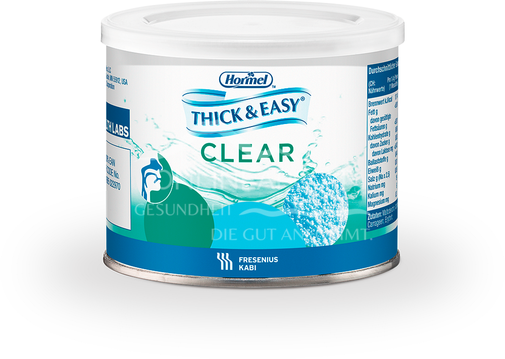 - Kontraindikationen: Nicht geeignet, wenn eine enterale Ernährung kontraindiziert ist, Nicht geeignet für Patienten mit angeborenen Stoffwechselstörungen, die Nährstoffe in Thick&Easy™ Clear nicht metabolisieren können, sowie bei Intoleranzen gegen einen in Thick&Easy™ Clear enthaltenen Inhaltsstoff.