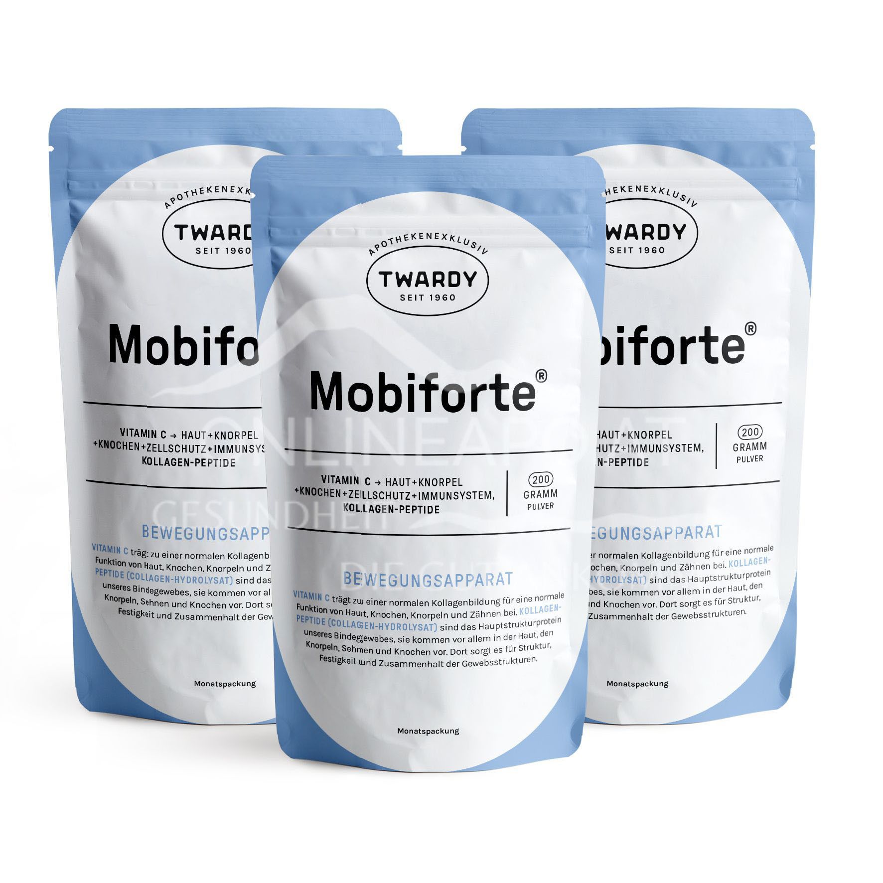 Twardy Mobiforte® Pulver ist ein Nahrungsergänzungsmittel mit sehr gut bioverfügbarem Collagen-Hydrolysat (= Kollagen-Peptide) und Vitamin C. Es ist gut verträglich und kann von Menschen jeden Alters verwendet werden.