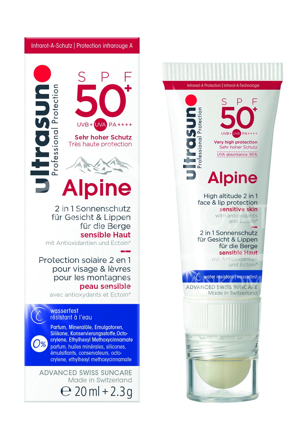 ULTRASUN Alpine SPF50+ Kombi ist ein 2 in 1 wasserfester Sonnenschutz für Gesicht & Lippen für einen perfekten Ski- und Wintertag mit Antioxidantien und Ectoin für sensible Haut.