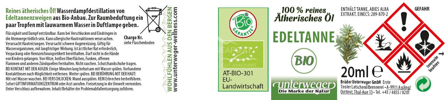 Die 100% reinen und BIO ätherischen Öle enthalten die Lebenskraft der Pflanzen in konzentrierter Form. Die wertvollen aromatischen Essenzen werden zum größten Teil durch Wasserdampfdestillation von Tannenzweigen gewonnen. Der Duft des Edeltannenöls belebt und bringt den Duft des Waldes in den Raum. Hergestellt gemäß AT-BIO-301.