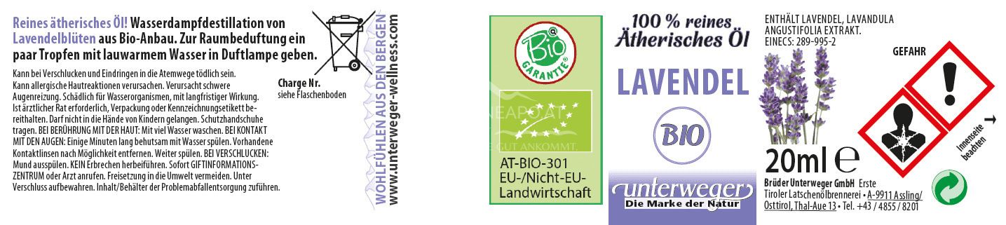 Entdecken Sie das reine Unterweger Bio Lavendelöl. 100% naturrein aus kontrolliert biologischem Anbau. Ideal zur Entspannung, für die Aromatherapie oder als natürliche Hautpflege.