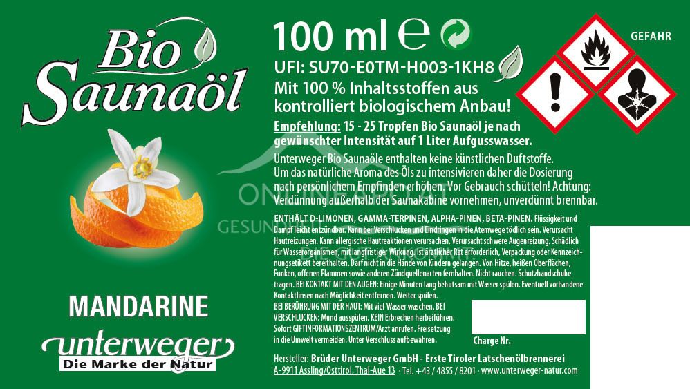 Verwandeln Sie Ihre Sauna in eine Oase der Sinne. Das Unterweger Bio Saunaöl mit echtem Mandarinenöl aus kontrolliert biologischem Anbau sorgt für einen fruchtig-süßen Duft, der entspannt und für gute Laune sorgt.