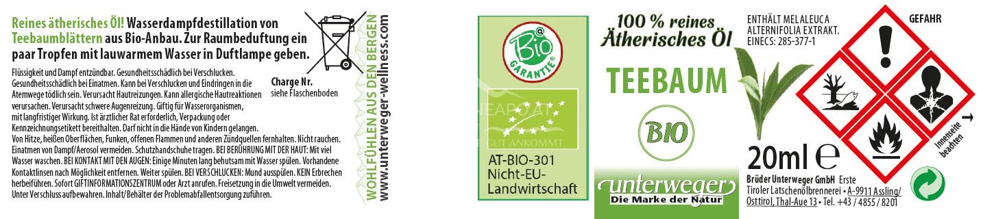 Die 100% reinen und BIO ätherischen Öle enthalten die Lebenskraft der Pflanzen in konzentrierter Form. Die wertvollen aromatischen Essenzen werden zum größten Teil durch Wasserdampfdestillation von Teebaumblättern gewonnen. Hergestellt gemäß AT-BIO-301.