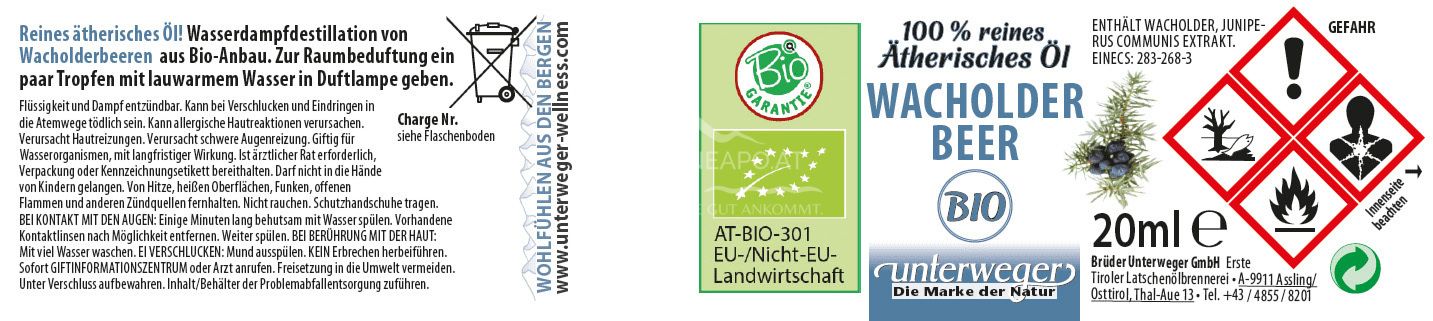 Entdecken Sie das 100% naturreine Bio Wacholderbeeröl von Unterweger. Dieses hochwertige ätherische Öl wird sorgfältig destilliert und ist ideal für die Aromatherapie, als Badezusatz oder für wohltuende Massagen.