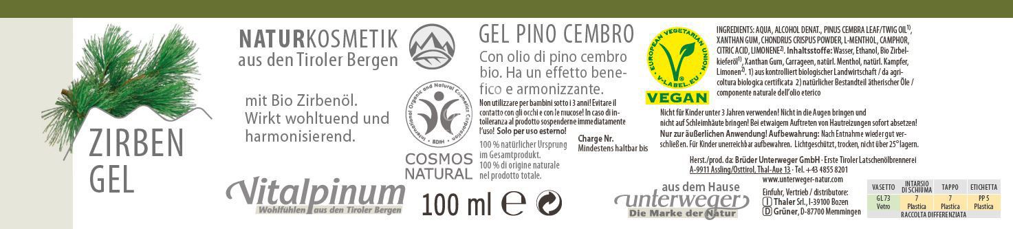 Entdecken Sie das bio-zertifizierte Zirben Gel von Vitalpinum Unterweger. Natürliche Pflege für Haut und Muskulatur mit der Kraft der Zirbe. Erfrischend, belebend und wohltuend für Ihr Wohlbefinden.