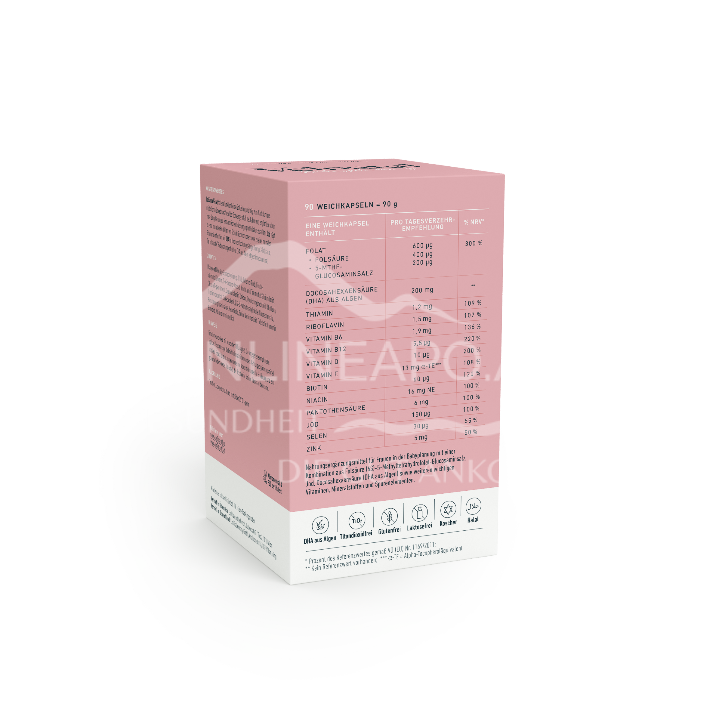 - Zusammensetzung pro Tagesdosis (1 Kapsel) %NRV*: Folat 600 µg 300 % davon Folsäure 400 µg und 5-MTHF-Glucosaminsalz 200 µg, Jod 150 µg 100 %, Docosahexaensäure aus Algen 200 mg **, Thiamin (Vitamin B1) 1,2 mg 109 %, Riboflavin (Vitamin B2) 1,5 mg 107 %, Vitamin B6 1,9 mg 136 %, Vitamin D 10 µg 200 %, Vitamin E 13 mg α-TE*** 108 %, Biotin 60 µg 120 %, Niacin (Vitamin B3) 16 mg NE **** 100 %, Pantothensäure (Vitamin B5) 6 mg 100 %, Selen 30 µg 55 %, Zink 5 mg 50 %. *% der Referenzmenge gemäß LIMV (EU) Nr. 1169/2011, ** keine Empfehlungen in der LIMV vorhanden. ***TE = α-Tocopheroläquivalent. ****NE = Niacinäquivalent.